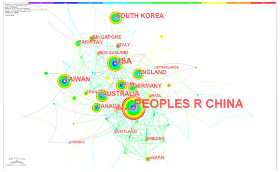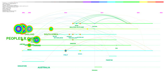 Next, we analyzed the countries/regions that published relevant articles in this field and generated a network of country collaborations, as shown in Figure 4. Therefore, we can find that countries/regions cooperate closely, especially countries with a large number of publications. Figure 5 shows the timeline of countries/regions starting research on CM knowledge services. As shown in Table 2, among the top 20 countries or regions (as shown in the table) of knowledge service research on CM, 8 are in Asia, including China, Taiwan (China), South Korea, India, Singapore, Pakistan, Japan, and Malaysia; 7 in Europe, including the United Kingdom, Germany, Italy, France, Sweden, Scotland, and Romania; in addition, there are the United States and Canada in North America, and Brazil in South America. There is no doubt that China is the country with the largest number of studies on CM, far exceeding other countries and regions, accounting for 69.1% of all publications. Centrality indicates the importance of a node, and among the 20 countries with the largest number of publications, China has the highest centrality, followed by the United States.
