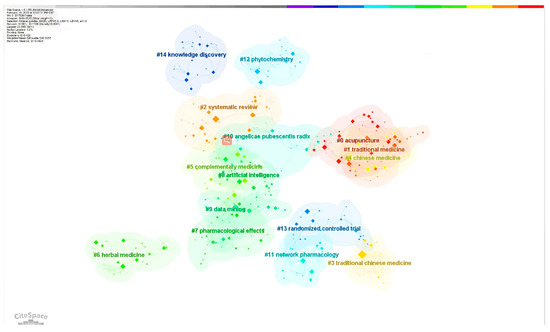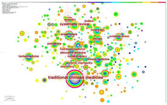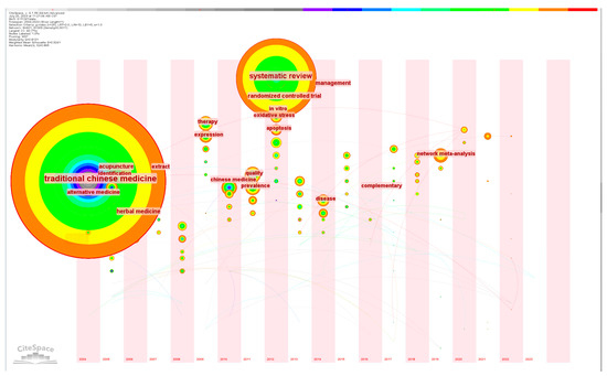 Keywords are highly concise and general about an article. By analyzing high-frequency keywords, we can understand popular research topics in this field. Important keywords, as shown in Table 3, include “traditional Chinese medicine”, “systematic review”, “acupuncture”, “prevalence”, “alternative medicine”, “complementary”, and “artificial intelligence”. It can be seen from Figure 6 that there is a strong connection between keywords, which indicates that most of the research in the field of CM knowledge services is multisubject. Figure 7 shows the timing of keyword co-occurrence. Keywords related to knowledge services include systematic review, knowledge, data mining, etc., indicating that most of the current research on knowledge services in CM is a systematic summary of previous knowledge and knowledge mining. In view of the combination of new technologies and products such as cloud computing and artificial intelligence derived from internet big data and CM, the modernization of CM is accelerating to achieve leapfrog development, which puts forward higher requirements for CM knowledge services. The research results show that the new generation of information technology can be combined with the academic thinking of CM [36] to provide knowledge services in various aspects such as pharmacological analysis [37], auxiliary diagnosis and treatment [38], and optimization of the diagnosis process [39].