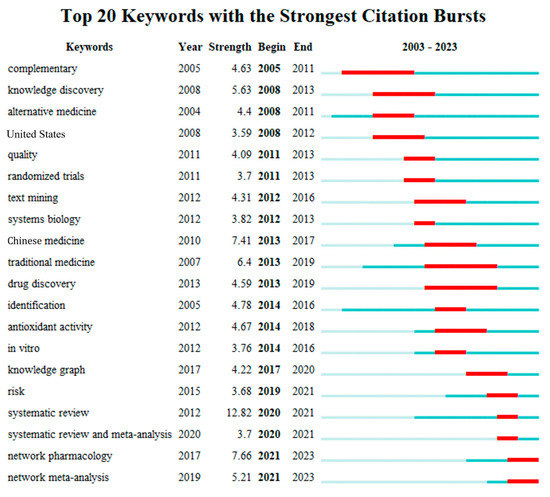 By studying the co-occurrence cluster analysis of these keywords, as shown in Figure 8, the research hotspots are mainly focused on the mechanisms of CM, knowledge mining and discovery in CM, application of artificial intelligence in CM, and alternative therapies. As shown in Figure 9, the thematic changes in research on intelligent CM knowledge services over the past 20 years can be observed through keyword clustering and emergent keywords. Strength refers to the burst strength of keywords. It can be seen from the words “complementary” and “alternative medicine” that CM often serves patients as a supplement to modern medicine. Yang et al. pointed out that CM is a good alternative to modern medicine because of its many targets and few side effects [40]. The prominence of words such as “randomized trials”, “systems biology”, “identification”, “antagonistic activity”, and “network pharmacology” over the past 20 years indicates the interest of scholars from various countries concerning CM mechanisms and the standardization and internationalization of CM data [28,29,30]. However, the diagnosis and treatment process of CM is based on the theoretical system of Chinese medicine by examining the condition, determining the type of disease, distinguishing symptoms, and using the method and viewpoint of dialectical treatment to treat the disease. Research on pharmacology or pathology alone is insufficient to cover the knowledge content of CM. Terms such as “knowledge graph”, “data mining”, “systematic review”, and “meta-analysis” indicate that organizing CM knowledge is usually done from a holistic perspective, such as association with CM philosophy, CM physiology, etiology, and pathogenesis. With the vigorous development of the internet, the application of new-generation information technologies such as big data and artificial intelligence in CM diagnosis has made CM diagnosis more quantitative, objective, and standardized [41], and the development of precise CM knowledge services is an inevitable requirement for the modernization of Chinese medicine. At the same time, it is necessary to maintain the dialectical characteristics of CM.