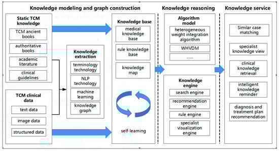 The application of new-generation information technology in the healthcare industry has also created opportunities for the transformation and upgrading of CM services. The Opinions on Promoting the Inheritance, Innovation and Development of Chinese Medicine, issued by the Central Committee of the Communist Party of China and the State Council in 2019, specifically emphasized the full use of new-generation information technologies such as big data and artificial intelligence in CM services, and promoted the deep integration and development of new-generation information technologies with CM health services. Compared with other disciplines, CM is an empirical science that relies more heavily on experience, and its knowledge is more complex and ambiguous. Currently, scholars and experts have achieved certain results in research on the internationalization, standardization, security, and application of artificial intelligence technologies such as deep learning and case-based reasoning (CBR) in CM [28,29,30]. However, there are still many gaps in the governance of cross-organizational, multimode, and heterogeneous data, organization of CM case knowledge, dynamic updating of knowledge, human–machine collaboration in CM knowledge discovery, and full-cycle personalized proactive knowledge services, which limit the accuracy and capabilities of CM intelligent knowledge services.