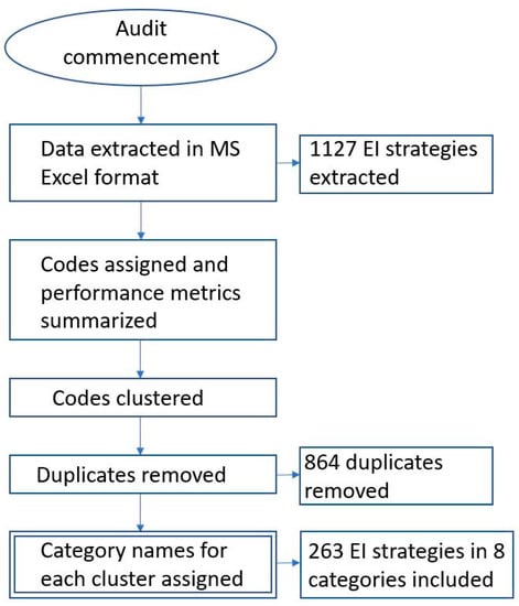 A taxonomy development process was undertaken following an established intuitive content management approach to audit and form clusters of similar EI strategies [14,15].