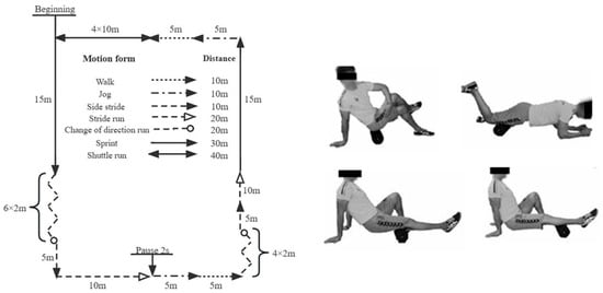 A formal basketball game consists of 4 quarters, with each quarter lasting 10 min. The rest time between the first and second quarters, as well as between the third and fourth quarters, is 120 s, and the halftime break is 10 min. The core players in a single game typically cover a distance of 5400–6000 m [26]. Moreover, the load of a basketball match is primarily assessed based on the players’ movement speed. The previous research has shown that a core basketball player engages in high-intensity movements for approximately 35% of the game, moderate-intensity movements for around 55%, and low-intensity movements for approximately 10% [27,28]. Thus, the time of the simulated basketball game in this study was strictly based on the official game time, incorporating the basic lower body movements of the basketball game, where one cycle consisted of a 10 m walk, 10 m jog, 10 m side stride, 20 m stride run, 20 m change of direction run, 30 m sprint, and 40 m shuttle run (Figure 1) [29,30]. So, the participants were required to complete one cycle within one minute. Each set comprised 10 cycles, and the participants completed a total of 40 sets (4 × 10) of simulated basketball game movements, covering a distance of 5600 m. The rest intervals were consistent with those in formal matches.