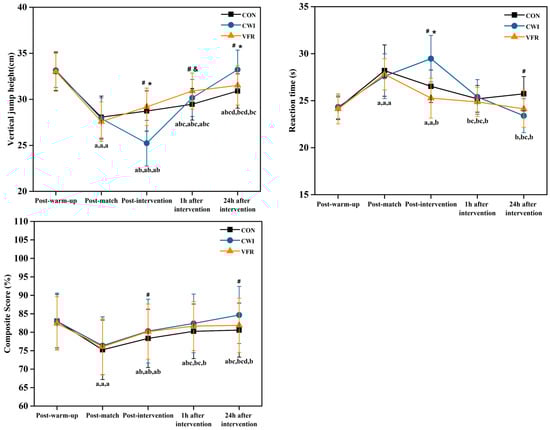 The height of the vertical jump of the control group rebounded slightly immediately after the game, 1 h after the intervention, and 24 h after the intervention but failed to return to its original level. Furthermore, there were significant differences between time points (p < 0.05), however, except for no significant difference between post-warm-up and 24 h post-intervention (p = 1.000). Although there was a significant drop in vertical jump height after CWI immediately, the recovery results showed an advantage at 1 and 24 h after the intervention, eventually returning fully to post-warm-up levels. There were no significant differences between 24 h after intervention and post-warm-up (p = 0.056), as well as between 1 h after intervention and post-warm-up (p = 1.000); there were significant differences between each time point (p < 0.05). The vertical jump height continued to rebound after the VFR and eventually returned almost to its original level.