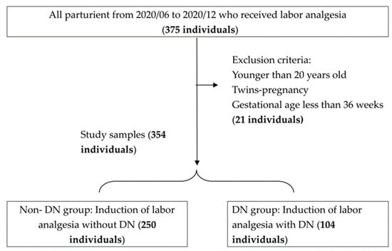 The sample size estimation was based on Cheng’s study []. We assumed that the satisfaction score would increase by 10% with DN involvement. We conducted a power analysis with a one-sided significant level of α = 0.05 and a power of 1 − β = 0.8. The results indicated that at least 295 people were needed. We enrolled all women who were admitted for vaginal delivery and received neuraxial analgesia via convenience sampling between July 2020 and December 2020. After conducting a thorough examination, we identified a cohort of 354 medical records that pertained to women with singleton pregnancies who were at or beyond 36 gestational weeks and received epidural anesthesia care in our labor wards during the study time. A flowchart depicting the selection process of the study population is presented in Figure 1.