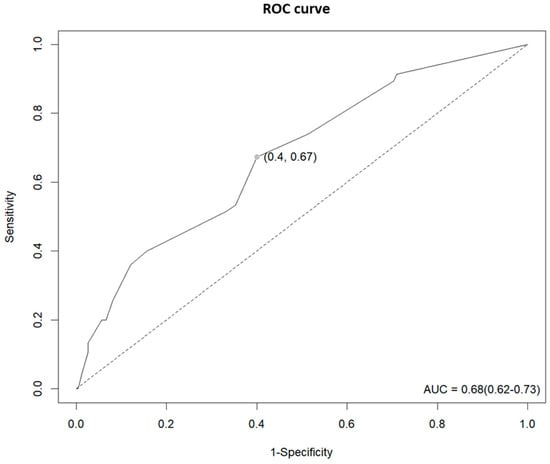 As can be seen in Figure 1, the MFS score was found to be an acceptable predictor of falls through the ROC curve (AUC = 0.68, 95% CI = 0.62–0.73) confirming that fall prediction using the MFS score was 68% accurate and the optimal cut-off point was 22.5. The ROC curve showed a sensitivity of 67%, a specificity of 60%, a positive predictive value positive of 45.7%, and a negative predictive value of 78.6%.
