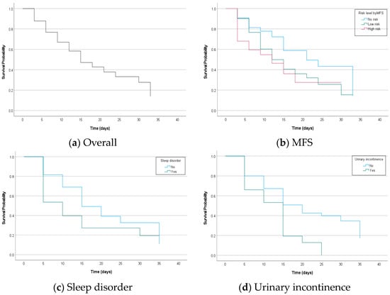 Kaplan–Meier curve displaying the estimated survival probability for patient falls against time (in days) according to (a) overall, (b) risk level by the MFS, (c) whether or not to have sleep disorder, and (d) whether or not to have urinary incontinence.