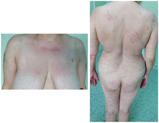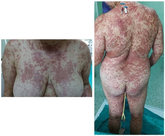 The differential diagnosis of SJS/TEN includes various infectious diseases, especially bullous pemphigoid, pemphigus vulgaris, and staphylococcal scalded skin syndrome (SSSS) [70]. Infections caused by herpes simplex virus and Mycoplasma pneumoniae can lead to oral mucositis and skin involvement but are not associated with skin detachment [16]. Other differential diagnoses include acute generalized bullous pustulosis (AGEP), autoimmune blistering diseases (paraneoplastic pemphigus), and generalized bullous fixed drug eruption (GBFDE) [56,71]. Lastly, acute graft versus host reaction may be confused with SJS/TEN, but it usually appears within 2 weeks after the cell transplant [56]. By considering the patient’s history, conducting bacteriological screening, and assessing bioumoral markers, we have excluded the main differential diagnoses.
