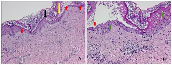 Skin biopsy—hematoxylin eosin staining showing transepidermal necrosis (black arrow) and dermis–epidermis detachment (yellow arrow), multiple inflammatory cells, and vacuolization at the dermo–epidermal junction (red arrows). (A) (HE, ×50); lymphocytic inflammation at the dermis level and at the dermo–epidermal junction (green arrows). (B) (HE, ×200).