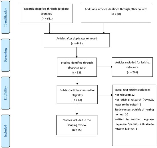Inclusion and exclusion criteria were used to select the studies selected. The selected abstracts were screened and read mainly by the two authors (GH, SK). The same authors independently reviewed the full text of the articles for inclusion, and any disagreements (eight full-text articles) were resolved through discussion until a consensus was achieved by all three researchers (GH, SK, DMP). It was decided that 28 of the 63 articles that did not meet the inclusion criteria should not be included. On completion of the review process, 35 articles were identified for charting. The selected articles were analyzed according to year, country, setting, sample, method, and three outcomes (methods and prevalence of physical restraint, reasons for using physical restraint, and interventions), as determined using previous literature.