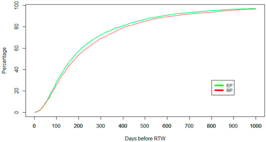 Proportion of RTW achieved by injured workers in the EP and RP groups.