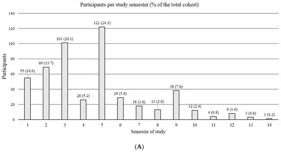 An analysis of participants with regard to the study semester revealed that most participants attended during their fifth semester (24.3% of all participants) and the majority of all participants were 20 (19.5% of all participants) or 21 (18.5% of all participants) years old (Figure 1).