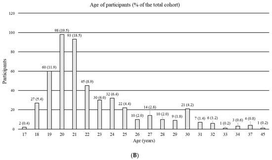 Distribution of participants: semester affiliation (A) and age (B).