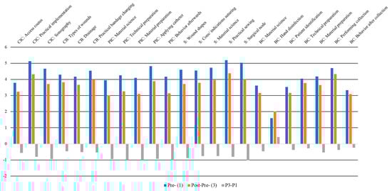 Comparison of differentiating pre- (blue) vs. post-pre (orange) evaluations depicted for statistically differentiating domains. Differences in post-pre minus pre-data are presented in gray (negative scores = a more critically assessment before the course, corrected afterwards to better pre-levels). Y-axis: Points and differences on the six-point Likert scale; X-axis: Different course concepts. Abbreviations: CIC, central indwelling catheter; CB, changing bandages; PIC, peripheral indwelling catheter; S, surgery; BC, blood collection.