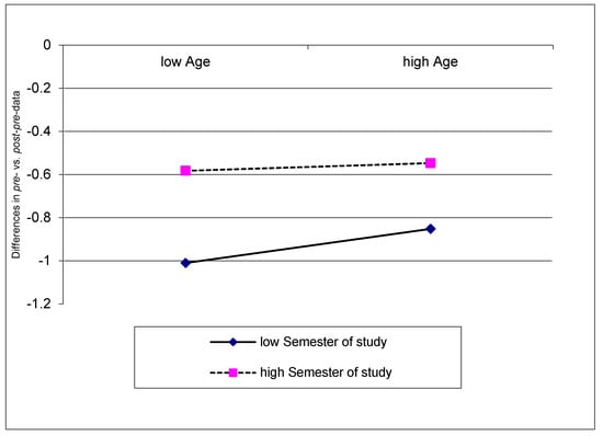 As a further approach, we set out to analyze the effects of age, study semester and their interaction on self-regulatory behavior using a moderated regression analysis. To analyze the self-regulatory behavior depicted as the difference in post-pre- minus pre-assessment, we assessed data from all five assessed technical courses, revealing an overall number of 2349 reflected items. The moderated regression analysis revealed that age (R2 = 0.001, F(1;2347) = 1.88, p < 0.665), semester of study (∆R2 = 0.001, ∆F (1;2346) = 0.012, p < 0.912) and the interaction of both (∆R2 = 0.001, ∆F (1;2345) = 10.72, p < 0.227) did not explain a significant amount of variance in the self-reflected variance (F = 0.55, p < 0.646). A simple slope analysis was conducted to illustrate the effects in a figure. Slopes for a tendentially low semester of study (b = 0.07, t = 0.29, p < 0.773) and high semester (b = 0.06, t = 0.07, p < 0.941) did not significantly differentiate from zero. Illustrations revealed that participants tended to have a more critical assessment of their competencies before the course and this was afterwards retrospectively adjusted to better self-assessed pre-competencies. This was, however, independent from the age and semester of participants (Figure 3).