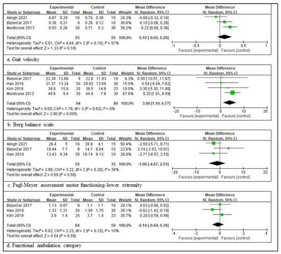 In patients with a subacute stroke, three RCTs involving 110 patients, providing the participants’ information, assessed the gait velocity [3,28,34]; four RCTs involving 183 patients, providing the participants’ information, assessed the BBS [3,32,33]. Three RCTs involving 90 patients, providing the participants’ information, assessed the FMA-LE score [3,28,32], and three RCTs involving 123 patients, providing the participants’ information, assessed the FAC score [3,32,33]. The scores for BBS are significantly different between the experimental and control groups. The total mean difference (95% CI) values were 3.98 (1.19, 6.77), and the heterogeneity values were Tau2 = 0.00, Chi2 = 1.79, df = 3 (p = 0.62), and I2 = 0% for BBS. The test for the overall effect yielded Z = 2.80 (p = 0.005) for BBS. However, the other three measures did not differ significantly between the experimental and control groups. The total mean difference (95% CI) values were as follows: 0.10 (−0.05, 0.26) for gait velocity, −1.18 (−4.67, 2.51) for FMA-LE, and −0.14 (−0.64, 0.36) for the FAC score. The heterogeneity values were as follows: Tau2 = 0.01, Chi2 = 4.64, df = 2 (p = 0.10), and I2 = 57% for gait velocity; Tau2 = 3.98, Chi2 = 3.22, df = 2 (p = 0.20), and I2 = 38% for FMA-LE; and Tau2 = 0.02, Chi2 = 2.23, df = 2 (p = 0.33), and I2 = 10% for the FAC score. The test for the overall effect yielded Z = 1.33 (p = 0.18) for gait velocity, Z = 0.59 (p = 0.56) for FMA-LE, and Z = 0.54 (p = 0.59) for the FAC score. A random-effects model was selected because of significant heterogeneity (Figure 2).