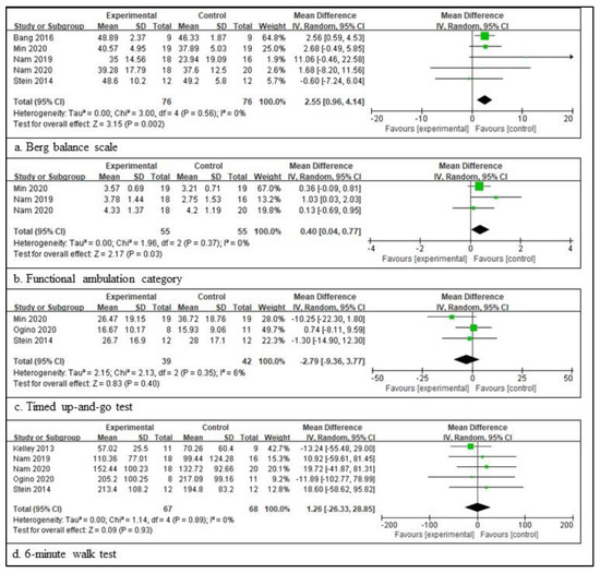 In patients with a chronic stroke, five RCTs involving 152 patients provided the participants’ information and assessed the BBS score [38,47,48,49,52], three RCTs involving 81 patients provided the participants’ information and assessed the TUG score [47,50,52], five RCTs involving 135 patients provided the participants’ information and assessed the 6mWT score [44,48,49,50,52], and three RCTs involving 110 patients provided the participants’ information and assessed the FAC score [47,48,49]. The scores for BBS are significantly different between the experimental and control groups. The total mean difference (95% CI) values were 2.55 (0.96, 4.14), and the heterogeneity values were Tau2 = 0.00, Chi2 = 3.00, df = 5 (p = 0.56), and I2 = 0% for BBS. The test for the overall effect yielded Z = 3.15 (p = 0.002) for BBS. The scores for FAC were also significantly different between the two groups. The total mean difference (95% CI) values were 0.40 (0.04, 0.77), and the heterogeneity values were Tau2 = 0.00, Chi2 = 1.96, df = 2 (p = 0.37), and I2 = 0% for the FAC score. The test for the overall effect yielded Z = 2.17 (p = 0.03) for the FAC score. However, the other two measures did not differ significantly between the experimental and control groups. The total mean difference (95% CI) values were −2.79 (−9.36, 3.77) for TUG and 1.26 (−26.33, 28.85) for 6mWT. The heterogeneity values were Tau2 = 2.15, Chi2 = 2.13, df = 2 (p = 0.35), and I2 = 6% for gait velocity, as well as Tau2 = 0.00, Chi2 = 1.14, df = 4 (p = 0.89), and I2 = 0% for 6mWT. The test for the overall effect yielded Z = 0.83 (p = 0.40) for TUG and Z = 0.09 (p = 0.93) for 6mWT. A random-effects model was selected because of significant heterogeneity (Figure 3).