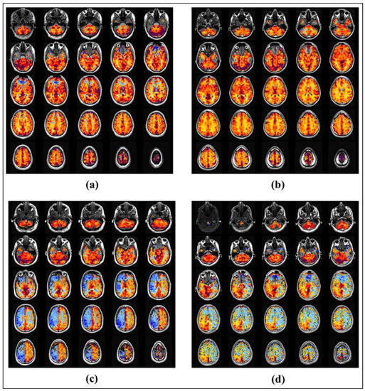 Figure 2. 5 × 5 mosaic images of the CVR maps from the input dataset. CVR maps in samples (a), and (b) were measured in healthy subjects and the maps in samples (c), and (d) were measured in SOD patients. As shown, there is a reduced CVR response in the right and left hemispheres of the brain in samples (c), and (d), respectively.