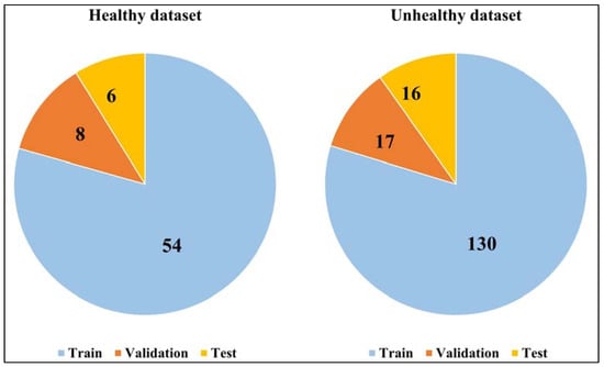 Figure 3. Distribution of the original dataset (68 healthy, and 163 unhealthy samples) into the train, validation, and test subsets. The splitting ratio within each category (healthy and unhealthy) is roughly 80%-10%-10%, as shown.