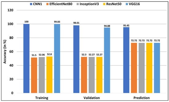 Some of the popular pre-trained networks, trained on the ImageNet dataset (ImageNet Large Scale Visual Recognition Challenge; ILSVRC) [53], were used to implement transfer learning using the CVR dataset. The networks investigated were EfficientNetB0 [54], InceptionV3 [55], ResNet50 [56], and VGG [57].