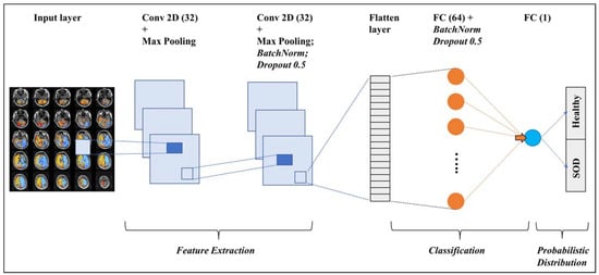 Figure 7. A schematic representation of the proposed CNN. The input layer is a matrix representation of the pixels in the input sample. Conv2D(32) represents a convolution layer with 32 filters, followed by a 2 × 2 2D max pooling layer. The second Conv2D layer has a batch normalization layer and a dropout layer after the max pooling layer. The features extracted by the convolution layers are fed into a flatten layer, which then goes into the fully connected layer with 64 nodes (represented as FC(64)). Finally, the output layer calculates a probabilistic distribution and classifies the input sample as a healthy subject or a SOD patient.