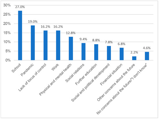 Not only did young people’s psychological distress increase significantly during the pandemic, but so did their concerns for the future [17,18]. Concerns and fears were identified in different areas of life.