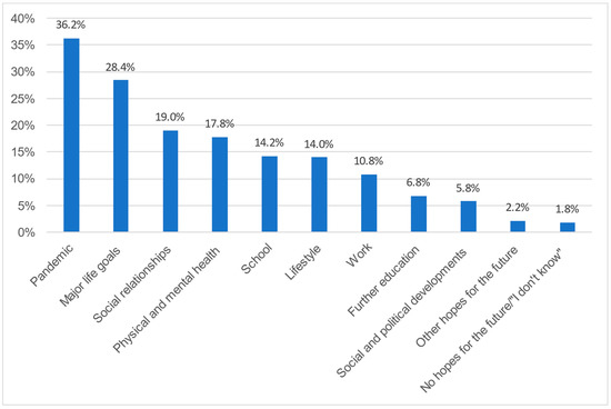 Several respondents (n = 34, 6.8%) wanted to complete their school-leaving examinations or graduate successfully from secondary school. N = 18 (3.6%) referred to their future school performance, expressing a desire to get good or better grades, to pass exams and thus pass the current school year. N = 18 (3.6%) commented on school organization and wished for a return to normal school attendance. Only a few expressed the opposite wish, that schools would remain closed and that there would be no exams, or that school would continue to be run in shifts n = 8 (1.6%) expressed the wish to have less stress at school and more free time in the future.