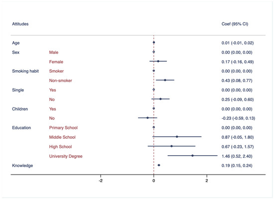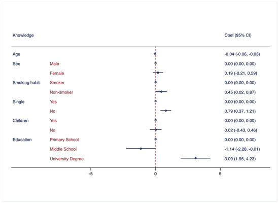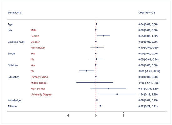To generate the knowledge, attitudes, and behaviors scores, individual scores from each section were summed up. The independent variables included in all of the models were: sex (1 = male, 2 = female), age (in years), education level (1 = primary school, 2 = middle school, 3 = high school, and 4 = university degree), marital status (1 = single; 2 = in a relationship), smoking habits (1 = smoker, 2 = non-smoker), and having children (1 = yes; 2 = no).