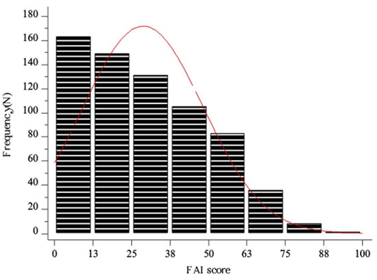 Histogram showing the distribution of FAI score in the whole study sample (N = 676). Red line–distribution.