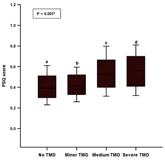 There was a significant difference (p < 0.001) in the comparison of the PSQ score between the groups of TMD severity depending on the FAI score (Figure 3). Medium and severe TMD had significantly higher PSQ scores, and a significant difference was found with the minor TMD and no TMD groups (no TMD—0.39 (0.30–0.51); minor TMD—0.41 (0.33–0.52); medium TMD—0.53 (0.40–0.66); and major TMD—0.56 (0.41–0.70)) (Figure 3).