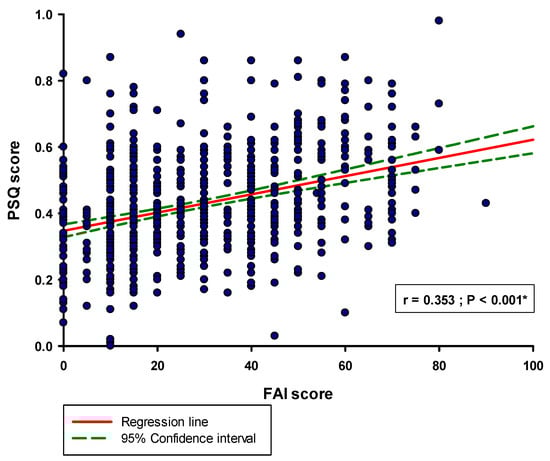 Furthermore, there was a significant positive correlation between the PSQ score and the FAI score (r = 0.353; p < 0.001) (Figure 4).