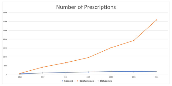 In 2016, when ixazomib was approved by the FDA, its utilization was as low as 582 prescriptions. It increased every year, with a significant increase of 82% in 2017, which caused its utilization to reach 1059 prescriptions. Then, ixazomib continued to be issued in more prescriptions but with a slower pattern, with a 24% (1318 prescriptions), 16% (1530 prescriptions), and 21% (1854 prescriptions) increase in its utilization in 2018, 2019, and 2020, respectively. In 2021, ixazomib utilization decreased slightly by −3%, with 1806 prescriptions; then, it increased again in 2022 to 1890 prescriptions (5% increase from 2021). The total prescriptions for ixazomib from 2016 to 2022 amounted to 10,039 prescriptions. Utilization increased from 2016 to 2022 by 225% (Figure 1).