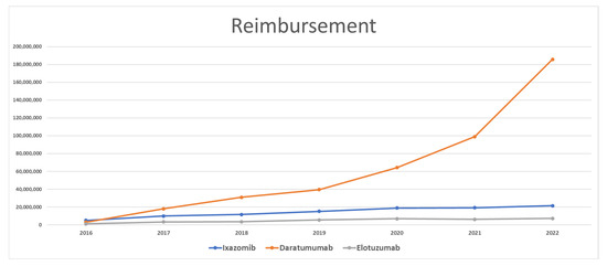 For reimbursement, the joinpoint model showed that daratumumab saw a non-significant increase between 2016 and 2020, followed by a significant APC increase from 2020 to 2022 (75.45, p-value < 0.05). It is pertinent to mention that the same model yielded a significant increase in the average annual percent change (AAPC) for daratumumab reimbursement from 2016 to 2022 (AAPC = 55, p-value < 0.05). Contrariwise, ixazomib and elotuzumab’s most significant APCs occurred from 2016 to 2020 (APC = 27.4 and 31.7, respectively, both p-values < 0.05). Both ixazomib and elotuzumab showed a significant AAPC (19.8 and 20.5, respectively, both p-values < 0.05) (Figure S1 in the Supplementary Materials).