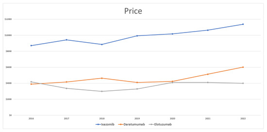 Ixazomib started with an average price of USD 8706. Prices fluctuated, increasing by 8% in 2017 and decreasing by −6% in 2018. In 2019, ixazomib’s price increased and reached USD 9933 (12% increase). It continued to increase in the following years until it reached USD 11,380 per prescription in 2022. The difference in price between 2016 and 2022 was 31%. The average price for ixazomib was USD 9871 (Figure 3).