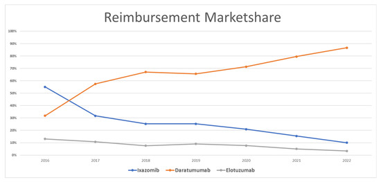 Figure 4 shows the utilization market share for MM medications. Once they were approved by the FDA in late 2015, daratumumab captured an average of 45% of the market, followed by ixazomib with 37%, and elotuzumab with the remaining 18% of the market. In 2017, daratumumab took a greater market share than its competitors and occupied 66% of the market, while ixazomib and elotuzumab represented 17% each of the Medicaid utilization market. The same scenario was repeated in the following years with MM medications. Daratumumab dominated the market and increased its market share to 90% in 2022, while ixazomib and elotuzumab shared the remaining 10% of the market. The overall average market share utilization for MM medications since 2016 was 15%, 74%, and 12% for ixazomib, daratumumab, and elotuzumab, respectively.