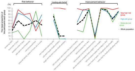 The researchers determined the number of classes of risk behavior and belief patterns associated with NCDs by entropy, AIC, BIC, and the proportion of individuals in each class (Table 3). Entropy was 0.887 for class 2, 0.934 for class 3, 0.907 for class 4, and 0.899 for class 5. Considering other factors, three cluster groups were defined. The mean proportions of the participants in each cluster group and the whole population are shown in Figure 1. Three cluster groups were named as follows: (1) very high-risk group (n = 58), which was characterized by high-risk behaviors, wrong beliefs, and less improvement behaviors; (2) high-risk group (n = 270), which was characterized by high-risk behaviors, right beliefs, and moderate improvement behaviors; and (3) moderate-risk group (n = 272), which was characterized by low-risk behaviors, right beliefs, and moderate improvement behaviors.