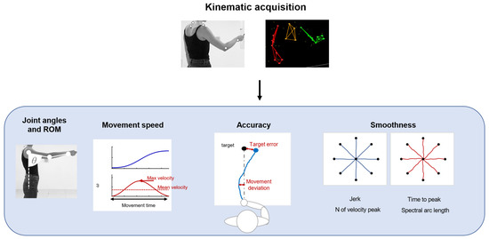 A schematic representation of the application of kinematics, such as joint angle and ROM analysis. Parameters based on movement speed, to evaluate movement accuracy and smoothness.