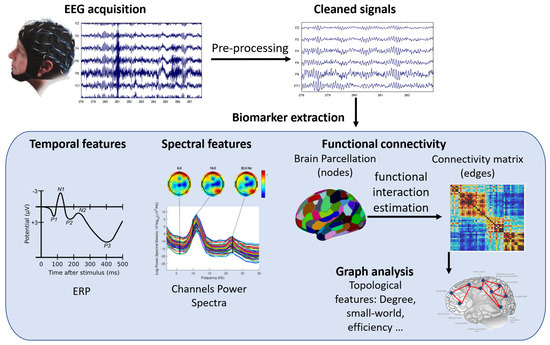 A schematic representation of EEG signal processing workflow and biomarkers. The figure shows the steps involved in acquiring, preprocessing, analyzing, and interpreting EEG signals for different applications in motor rehabilitation. The biomarkers include event-related potentials (ERP), power spectrum, functional connectivity, and graph analysis.
