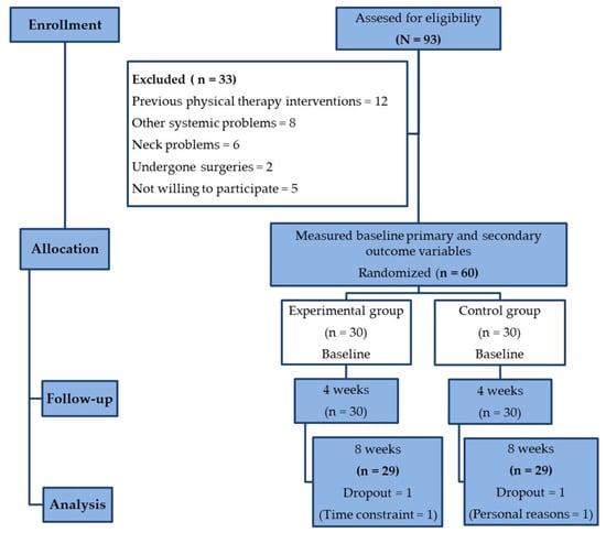 Ninety-three participants were recruited for the study. The CONSORT flow chart in Figure 1 presents a comprehensive overview of the screening, enrollment, randomization, and analysis of the participants included in this study. Sixty participants with chronic NSNP were voluntarily selected as per the eligibility criteria and allocated equally into two groups. Following group allocation, one participant from each group did not complete the 8-week intervention program due to time constraints and personal reasons (Figure 1). In the study analysis, the intention-to-treat analysis was used.