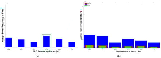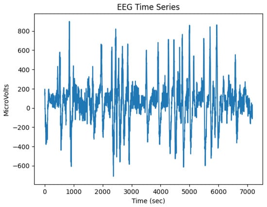 The electroencephalographic sample database consists of 124 time-varying samples containing between nine thousand and fifteen thousand records each, with a range between 18 and 30 s. Table 3 shows a sample of the first 10 brain activity values from both raw signals and preprocessed signals, such as Delta, Theta, Low Alpha, High Alpha, Low Beta, High Beta, Low Gamma, and High Gamma frequency bands (Figure 11), along with the subject’s percentage of attention (Atte) and meditation (Med) during the test. The EEG sensor TGAM1 sampling rate is 512 samples per second for only the RAW time series, while the rest of the time series it is one sample per second. It is important to mention that all brain activity rhythms, attention and meditation, are preprocessed within TGAM1 at a rate of 1 Hz, and their equations are proprietary to NeuroSky. Therefore, based on Equation (1), the RAW signal is converted to microvolts () and the power spectral density is calculated.