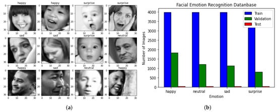 In this way, this project uses two datasets, as shown in Figure 3. The exploratory data analysis is divided into test, train, and validation. The size of the train dataset is 15,109 images, the test dataset is defined by 128 images, and the validation dataset has 4977 images. Figure 3a shows a sample of this dataset. Also, in Figure 3b, the size and distribution of EDA is depicted. This approach involves performing EDA and creating initial models from scratch. During EDA, properties of the input images, classes, and data distribution are examined. The different classes of faces and their characteristics are as follows: happy faces have a smile and eyes somewhat closed with visible teeth, sad faces have eyebrows furrowed and a mouth with the opposite shape of a happy face, neutral faces have no particular expression and share some features with sad faces, and surprised faces have open mouths and eyes wide open, often with hands on the face in many samples.