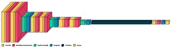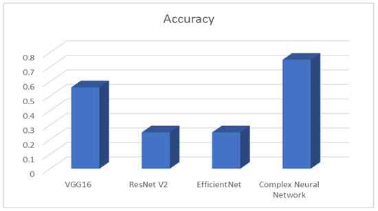 Thw VGG16, ResNet V2, and EfficientNet neural network models have the following architecture: The first convolutional layer has 24 filters, a kernel size of 3 × 3, and the same padding. The input shape is (32,32,1), with a LeakyRelu layer with a slope of 0.1. The second convolutional layer has 32 filters, a kernel size of 3 × 3, and the same padding, with a LeakyRelu layer with a slope of 0.1, a max pooling layer with a pool size of 2 × 2, and a batch normalization layer. The third convolutional layer has 32 filters, a kernel size of 3 × 3, and the same padding, with a LeakyRelu layer with a slope of 0.1. The fourth convolutional layer has 64 filters, a kernel size of 3 × 3, and the same padding, with a LeakyRelu layer with a slope of 0.1, a max pooling layer with a pool size of 2 × 2, a batch normalization layer, a flatten layer to transform the output from the previous layer, a dense layer with 48 nodes, and a dropout layer with a rate of 0.5. The final output layer has 4 nodes (number of classes) and a softmax activation function. Finally, the model is compiled with categorical cross-entropy loss, Adam optimizer with a learning rate of 0.001, and the metric set to accuracy. The total parameters for VGG16 are 14,714,688; 42,658,176 parameters for ResNet V2; and 8,769,374 parameters for EfficientNet.