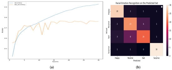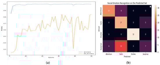 The outcomes of this stage of the project show that DS-CNN does not show overfitting and increases the efficiency regarding other architectures. Overall accuracy reaches 79% and, among the four emotions, surprise is the one that obtains the best results. Figure 8 shows the main result of DS-CNN. Figure 8a,b, along with Table 2, depict, respectively, the accuracy, confusion matrix, and the classification report of the model. The model can be observed to have high percentages of assertiveness and accuracy, with an average of 79%. This indicates that it is a robust model that has significant opportunities for improvement. We can determine if there is no overfitting in a deep learning model by analyzing its performance on both the training and validation datasets. Overfitting occurs when a model performs exceptionally well on the training data but fails to generalize to new, unseen data (validation or test data). If the training and validation accuracies are both high and show similar trends as the model is trained, this points out that the model is not overfitting. To further confirm the absence of overfitting, we can compare the model’s accuracy on the training and validation datasets throughout the training process. If the training accuracy continues to increase while the validation accuracy plateaus or remains stable, it suggests that the model is not memorizing the training data but rather learning to generalize to new data. Running the model for more epochs may lead to better results if there is no overfitting, because the model continues to learn from the training data and improve its performance. However, if overfitting is present, continuing to train the model for more epochs can worsen its generalization capabilities, as it will increasingly memorize the training data and lose the ability to generalize to new data. Finally, by monitoring the training and validation accuracies and ensuring they both perform well without significant divergence, we can conclude that there is no overfitting. In such cases, running the model for more epochs may lead to improved results and better generalization.