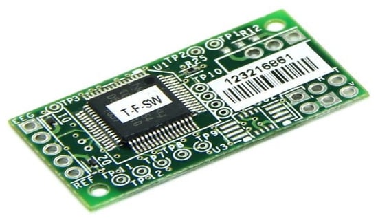This work uses the EEG device ThinkGear TGAM1, since it collects neural signals and inputs them into the ThinkGear chip for processing the signal into a sequence of usable data and filtering any interference in a digital way. Raw brain signals are amplified and processed to provide concise contributions to the device. The device considered to be the interface between the brain and the computer is the NeuroSky ThinkGear module, shown in Figure 10, since it meets the requirement of being a noninvasive method, while also having a reliability rate of 98%. The electrode is placed in position [,].
