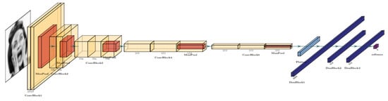 This solution designs an architecture of Deep Convolutional Neural Networks. This architecture includes convolutional layers in six blocks, as well as some batch normalization layers. In this model, also called DS-CNN, each convolutional block has one CNN 2D layer, followed by a batch normalization, an ELU activation, and a max pooling 2D layer. For this architecture, any dropout layers with a dropout ratio of 0.4 are defined. Figure 7 shows the architecture of DS-CNN.