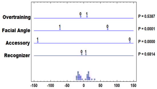 Now, for testing the main factors that affect this proposal, a multifactorial ANOVA over the F1 Score is performed, which is a procedure that performs an analysis of variance of several factors for F1 Scores. In addition, various tests and graphs are performed to determine which factors have a statistically significant effect on the F1-Score. Any ANOVA table contributes to the identification of significant factors. For each significant factor, the Multiple Range Tests distinguish which means are significantly different from others. For the factors overtraining and recognizer, there are no statistically significant differences between any pair of means, with a confidence level of 95. 0%. For the variables accessory and facial angle, they indicate that there are statistically significant differences with a confidence level of 95.0%. The analysis of variance for F1-Score—Type III Sum of Squares, Table 5, decomposes the variability of the F1-Score metric into contributions due to various factors. Since Type III sum of squares (default in Statgraphics) was chosen, the contribution of each factor is measured by removing the effects of the other factors. The p-values test the statistical significance of each of the factors. Since the p-values for B. accessory and C. facial angle are less than 0.05, these factors have a statistically significant effect on F1-Score at a 95.0% confidence level; see Table 5.