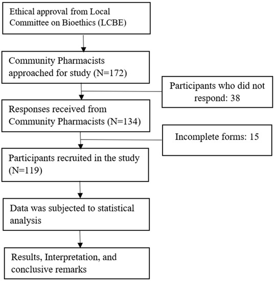 A cross-sectional study was conducted among community pharmacists working in Al-Jouf province, Saudi Arabia. Data were collected over a period of four months (January to April 2022). Al-Jouf is one of the 13 provinces of KSA, having an estimated population of 0.5 million [15]. It is a less-developed province in the northern region sharing its border with Jordan, in comparison to the metropolitan provinces. Being a remote region, there is limited access to healthcare facilities as well as healthcare professionals including pharmacists. Inclusion criteria for this current study include: (1) a qualified pharmacist working in a community pharmacy, (2) willing to participate in the survey, (3) either male or female gender, (4) employee or self-employed, and (5) able to write and understand Arabic and English. Those participants who did not fulfill the criteria were excluded from the study. The flow diagram of the present study is shown in Figure 1.