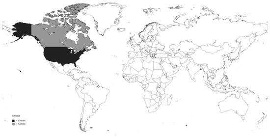 Heat map of the literature. This map illustrates the articles’ countries of origin. Lighter color represents smaller numbers of articles and darker color represent greater numbers of articles.