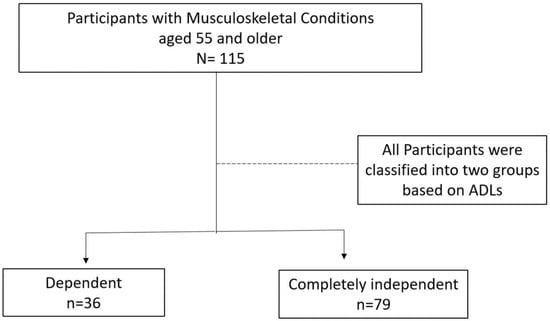 In this study, 115 participants over the age of 55 were analyzed, with 36 individuals (31.3%) classified as dependent and 79 individuals (68.7%) categorized as completely independent in ADLs (as shown in Figure 1). Table 1 provides a summary of the participants’ demographic characteristics. The sample consisted of 58 male participants (50.4%) and 57 female participants (49.6%), with an average age of 63.2 years (SD: 7.4). It is worth noting that the completely independent group had an average age that was five years younger than the dependent group. Most participants (79.1%) had completed intermediate school or below. Additionally, a significant number of participants were classified as overweight regardless of their dependency status. The mean NPRS score for the entire sample was 6.52 (SD = 1.9), with the dependent group exhibiting a higher mean NPRS score than the independent group, indicating more pain. Furthermore, the average number of comorbidities for the entire sample was 2.01 (SD = 1.6), with the dependent group demonstrating a significantly higher mean number of comorbidities than the independent group, indicating more medical conditions.
