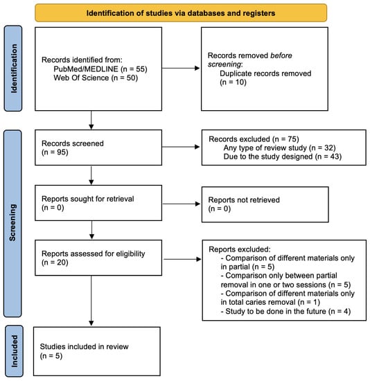Initially, 105 articles were identified in electronic databases (PubMed [n = 55]; Web Of Science [n = 50]). Of the 105 articles found through the search strategy, 10 duplicate articles were removed. A total of 95 articles remained and were reviewed by title and abstract. By checking by title and abstract, 75 articles that did not meet the inclusion criteria were excluded (k = 0.92) (reasons: review studies and design of the project/study). After applying the inclusion and exclusion criteria, the remaining 20 articles were considered for the full-text reading, which led to the exclusion of 15 articles. The reasons for these exclusions were: 5 compared different materials in only partial removal; 5 compared only partial removal in one or two sessions; 1 compared different materials only in nonselective caries removal; and 4 had an absence of numerical data. Therefore, the remaining 5 articles met the eligibility criteria and were included in this study (Table 1). The designs presented were: 5 randomized clinical trials [,,,,] developed between 2010 and 2021 (k = 1). The flowchart diagram with the study selection process is shown in Figure 1.