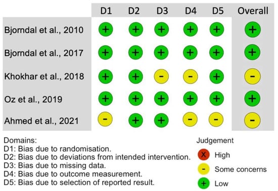 The risk of bias and the quality of the included studies were independently assessed by two reviewers (N.F. and A.C.V.M.M.) using the RoB 2 tool (Cochrane Risk of Bias Tool for Randomized Trials) []. This tool is structured in five domains (D) where the bias can be evaluated. Study quality was assessed in three categories: high risk of bias, few concerns, and low risk of bias. The quality assessment aimed to estimate the relative effect of two interventions or intervention strategies proposed in a clinical study and which produced the result. The ratings obtained were verified by a third reviewer (T.K.T.).